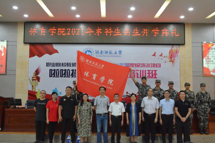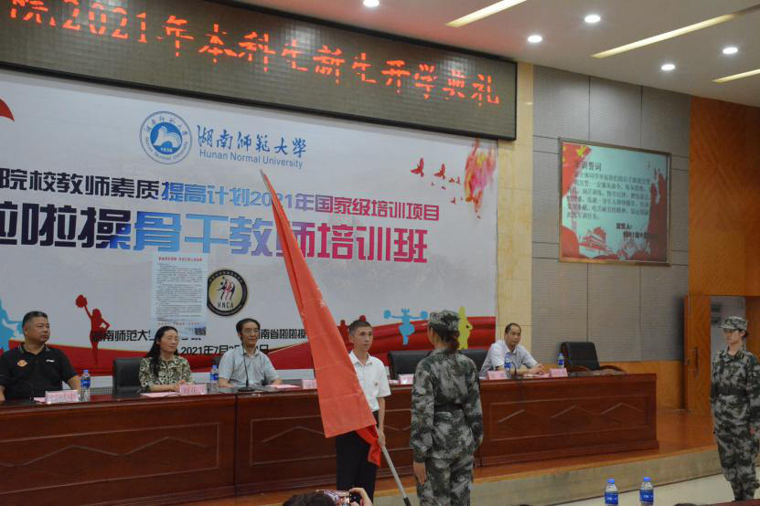 李明辉为beats3652021级军训方阵授旗并合影留念。