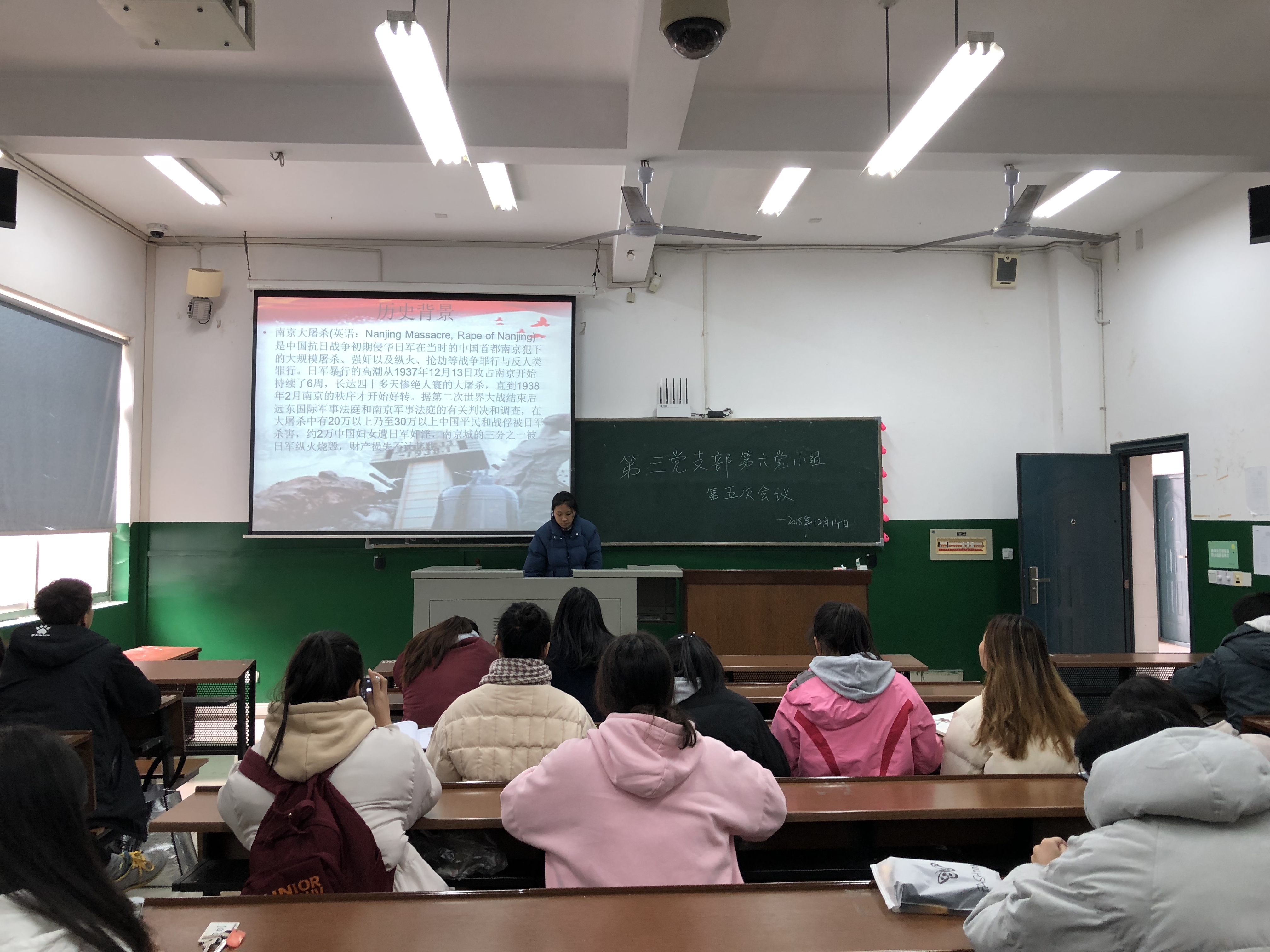 (通讯员 谢颖 陈晓琪)12月14日中午,党支部第六党小组在教学楼201教室召开了第五次专题学习会议。本次学习的主题是“南京之痛,国之痛”与“国无德不兴,人无德不立”,本次会议由朱丹琳主持。
