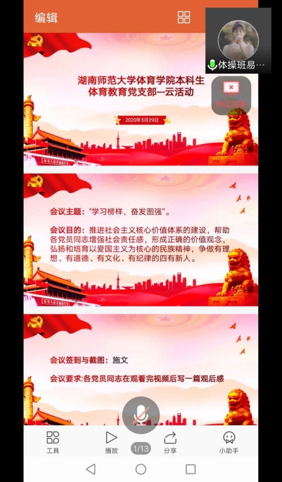 (通讯员 夏禹 杨金灵 杨卯)5月29日中午12点30,公司本科生体育教育党支部召开“学习榜样,奋发图强”主题云会议。会议由党支部书记夏禹老师、易雯婷同志主持,支部全体成员参与。