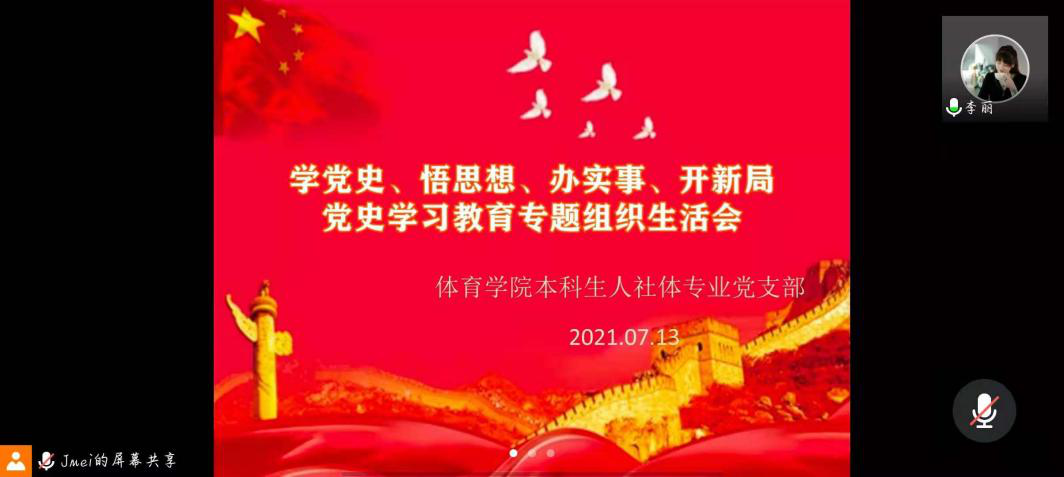 (通讯员 彭美 蒋妹)2021年7月13日上午,公司本科生运动人体科学、社会体育指导与管理专业本科生党支部在腾讯会议召开学党史、悟思想、办实事、开新局党史学习教育专题组织生活会。出席本次会议的有党支部书记李丽以及全体支部成员,本次会议由党员蒋妹主持。