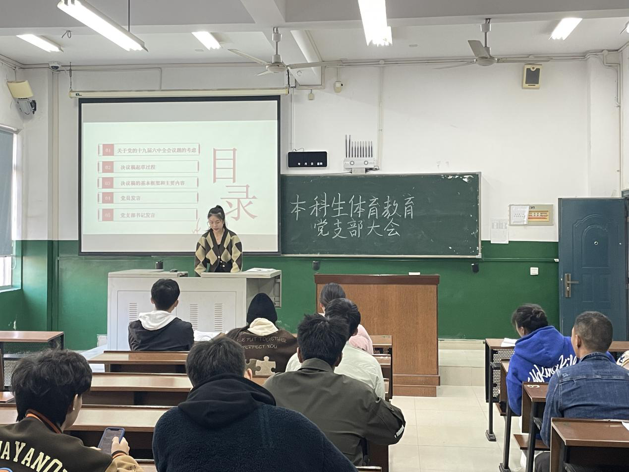 (通讯员 邱玥)11月27日上午,公司于鸿健楼203教室召开本科生体育教育党支部大会,本次大会的主要内容是学习《中共中央关于党的百年奋斗重大成就和历史经验的决议》,本科生体育教育党支部书记夏禹出席本次会议,参加会议成员一共有34人,其中在常德实习的成员以视频会议的形式参加,会议由李羽鑫主持。