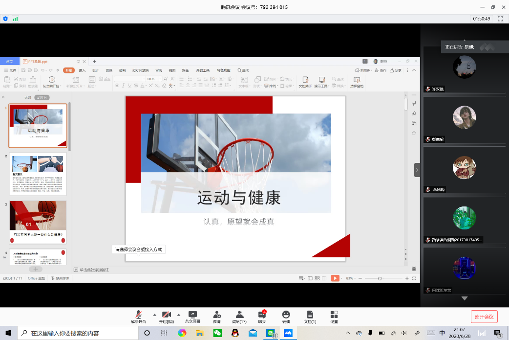 (通讯员 欧阳志宏)2020年6月29日晚19:30,beats3652017级“曜熠凌云”实习队线上课件制作与说课考核在腾讯会议上如期举行。课件制作与说课考核的主体为“体育与健康”,评委老师为实习队指导老师匡梨飞和上官戎,十一队全队队员接受考核。