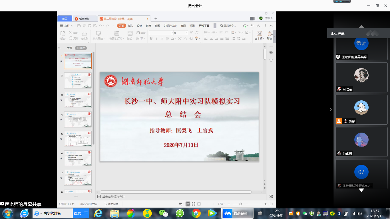 (通讯员 吕欣荣 张玉莹 涂缘)7月13日晚19:00,2017级模拟实习四队、十一队及实习队指导老师匡梨飞、上官戎于腾讯会议召开线上模拟实习总结会议。会议由指导老师匡梨飞主持。