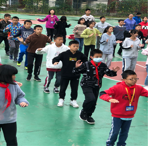 (通讯员 史润发 晏涵迎)11月3日,下午2:00师大附中高新实验中学初一年级开始学习本校自编的特色舞蹈,首先同学们在实习老师的指导下熟悉动作,之后骞翮二队队员吴玉兔在台上喊着口令示范动作,其他队员在旁协助,最后在队员们及员工的努力下,顺利完成本次课间活动,骞翮二队队员们通过本次大课间活动,队员们感受到了当老师的乐趣。