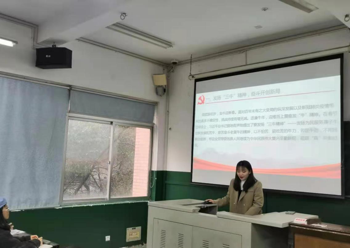 会议伊始,易雯婷就习总书记提出的“三牛精神”的具体内容进行讲解。紧接着,由4位发言人依次发表自己对于三牛精神的见解并结合实际进行分享。
