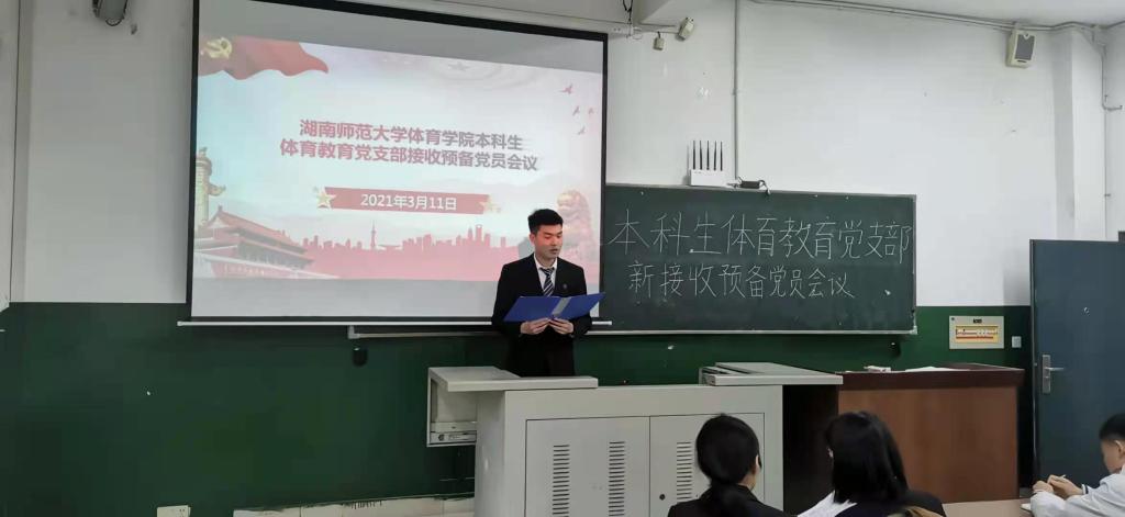 (通讯员 谢珊)3月11日中午11:40,公司在鸿健楼202教室召开体育教育党支部接收预备党员会议。党支部书记夏禹、2017、2018级体育教育党支部预备党员参加会议,其中拥有表决权的成员一共有15位,新接收预备党员一共有3位。本次会议由党支部副书记易雯婷主持。