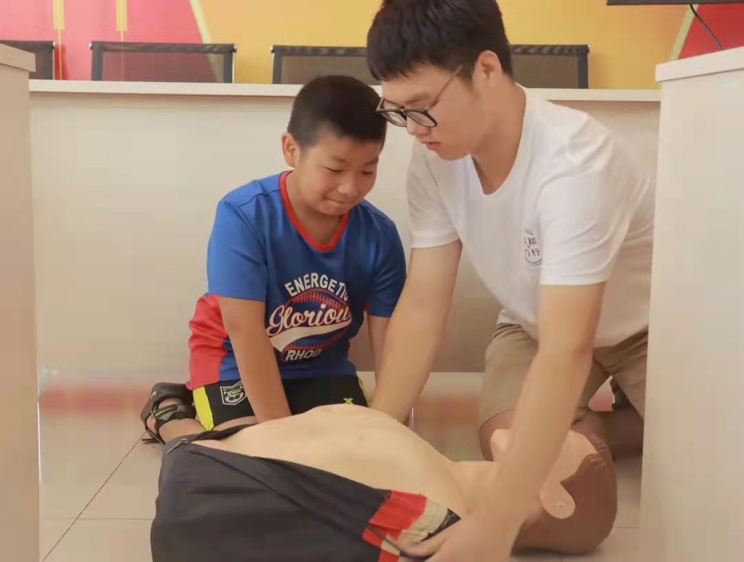 首先,由邱佳然向大家示范如何处理游泳时小腿抽筋的情况,表达方式简洁明了。而后由邓云帆示范心肺复苏急救法,并带领孩子现场模拟急救场景,对孩子的防溺水意识增长意义重大。
