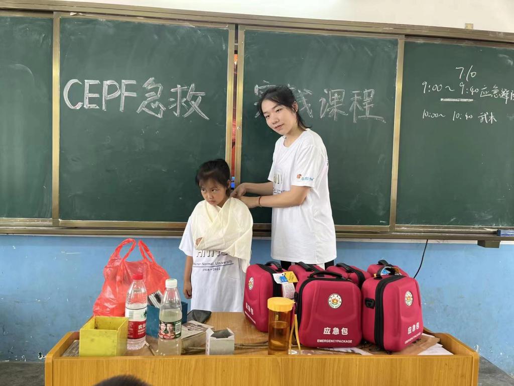 消防避险课程主要培养学员的耐力、反应力,在教会同学识别消防标识、器材并引导员工了解它们的使用方法外,通过消防知识与体适能训练相结合,提升青少年儿童面对突发的消防事故时的应对能力,在提升青少年儿童身体素质的同时,降低社会突发消防事故伤亡率。医疗急救避险课程倡导“人人会急救”的思想,在此次暑期社会实践活动中,团队成员带领实践地公司同学了解三角巾在包扎时的适用情况,能够掌握头部包扎、风帽式包扎、悬臂包扎、胸背包扎等包扎方法。通过对于青少年相关急救知识的培训与教学,达到青少年在紧急情况发生时能够第一时间进行反映,并做出处理,以减少二次损伤。在防溺水避险课程中组织同学们进行防溺水情景模拟,通过体适能训练提高儿童的身体素质,并且掌握基本溺水自救方法,以及心肺复苏等急救方法。在应激反应避险课程中,领梦者实践团践行快乐体育的教学理念,通过设置“男生女生向前冲”冲关挑战的形式,主要培养学员敏捷性、反应力和自我保护能力,提高辨别和应对危险的能力,增强安全防范意识。