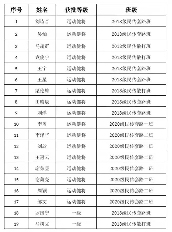 2021年11月9日收到中国龙狮运动协会下发关于《中国龙狮运动协会运动员技术等级管理办法(试行)》的通知,公司按照文件要求积极整理相关资料,加快推进舞龙舞狮运动员技术等级申报工作,在2018年—2021年相关赛事中,beats365官方网站龙狮团队共有32名同学荣获首批“龙狮运动员等级”称号,其中梁贤、马超群等30位同学获批“运动健将”称号,马树立等2位同学获批“一级运动员”称号。