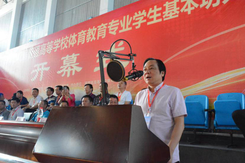 湖南省教育厅体卫艺处处长彭四龙宣布湖南省第五届普通高等公司体育教育专业员工基本功大赛开幕。