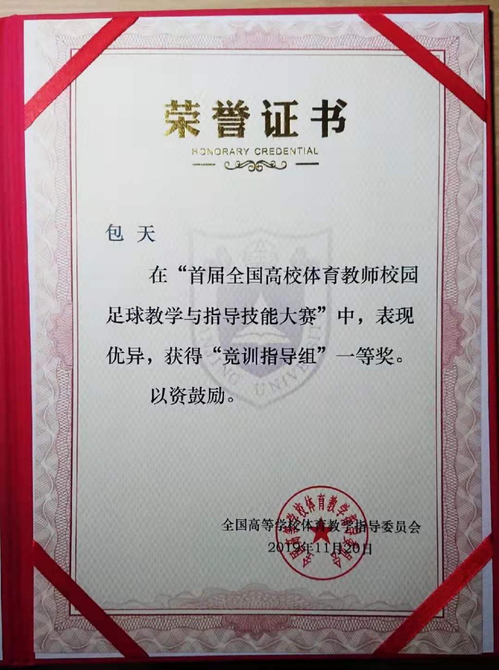 为了在本次比赛中取得好成绩,公司领导高度重视,对足球教研室和包天老师提出了明确的参赛要求,并给予了大力的支持。beats365足球教研室群策群力,在教学训练方案的制定、教学训练视频的拍摄制作、体能技能训练计划等方面进行了深入的讨论,制定了切实可行的备战方案。包天老师克服了备战时间短、日常教学任务重等困难,全力以赴,精心准备,刻苦训练;在参赛过程中不畏强手,敢于拼搏,多项测试成绩名列前茅,最终以总成绩排名第2的优异成绩,获得大赛的一等奖,为beats365官方网站赢得了荣誉!