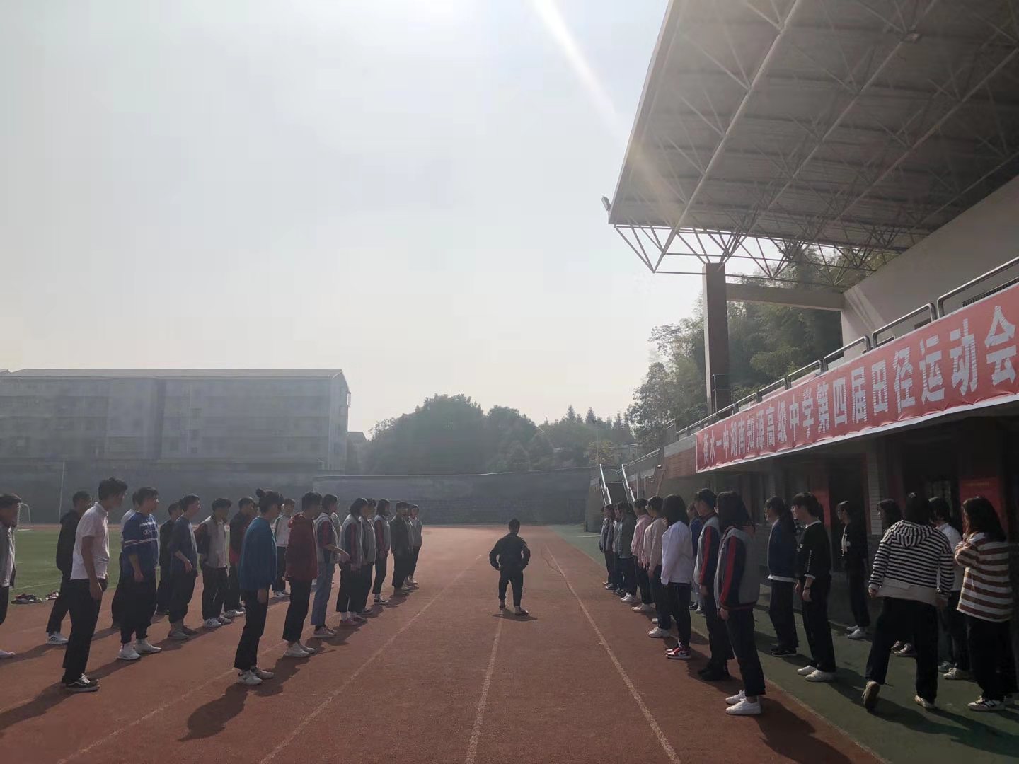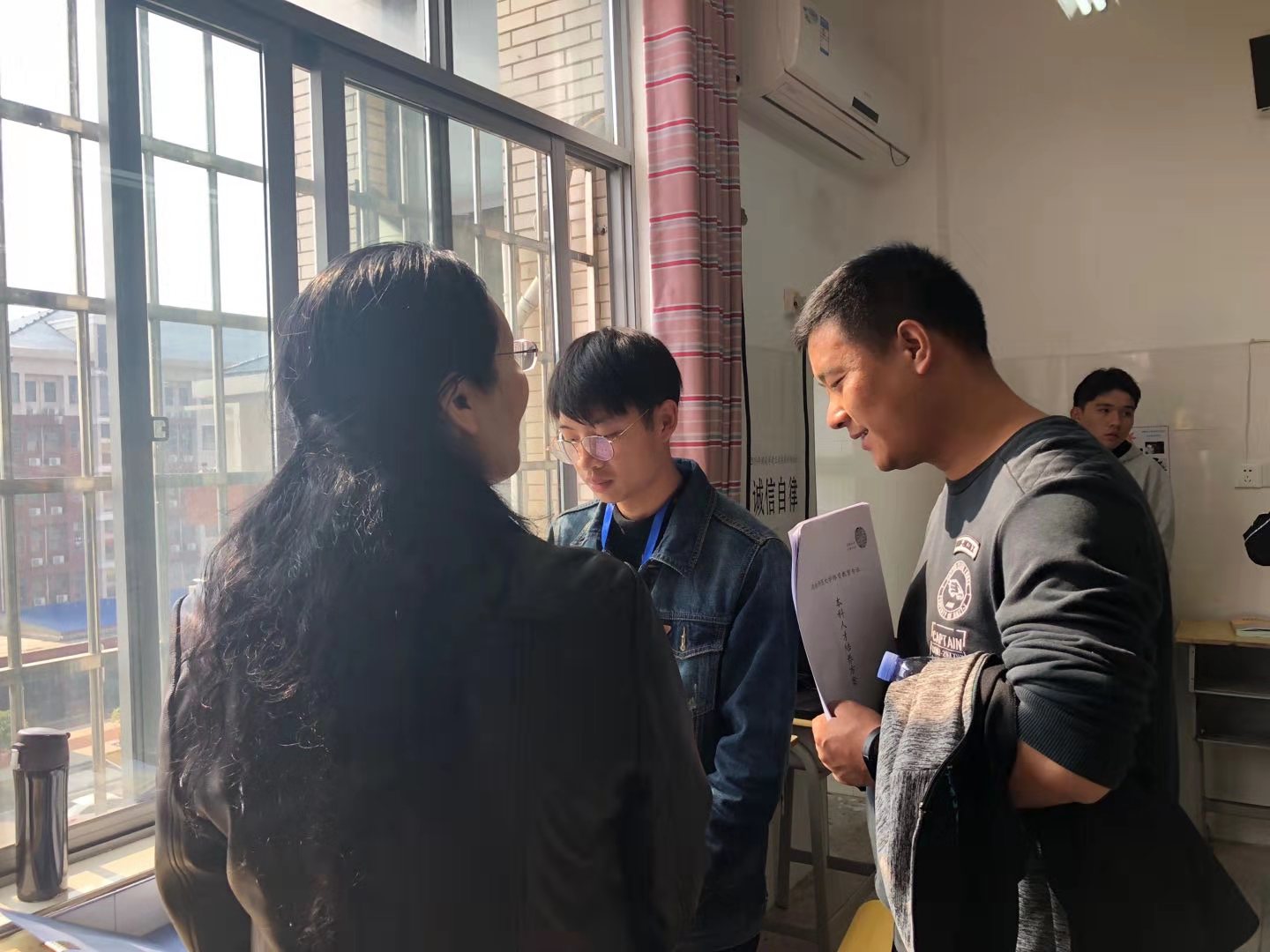会后,一行人在知源中学田径场观看、指导了实习队员熊智慧、周庆阳的授课情况,并在实习办公室查看了队伍的实习材料。