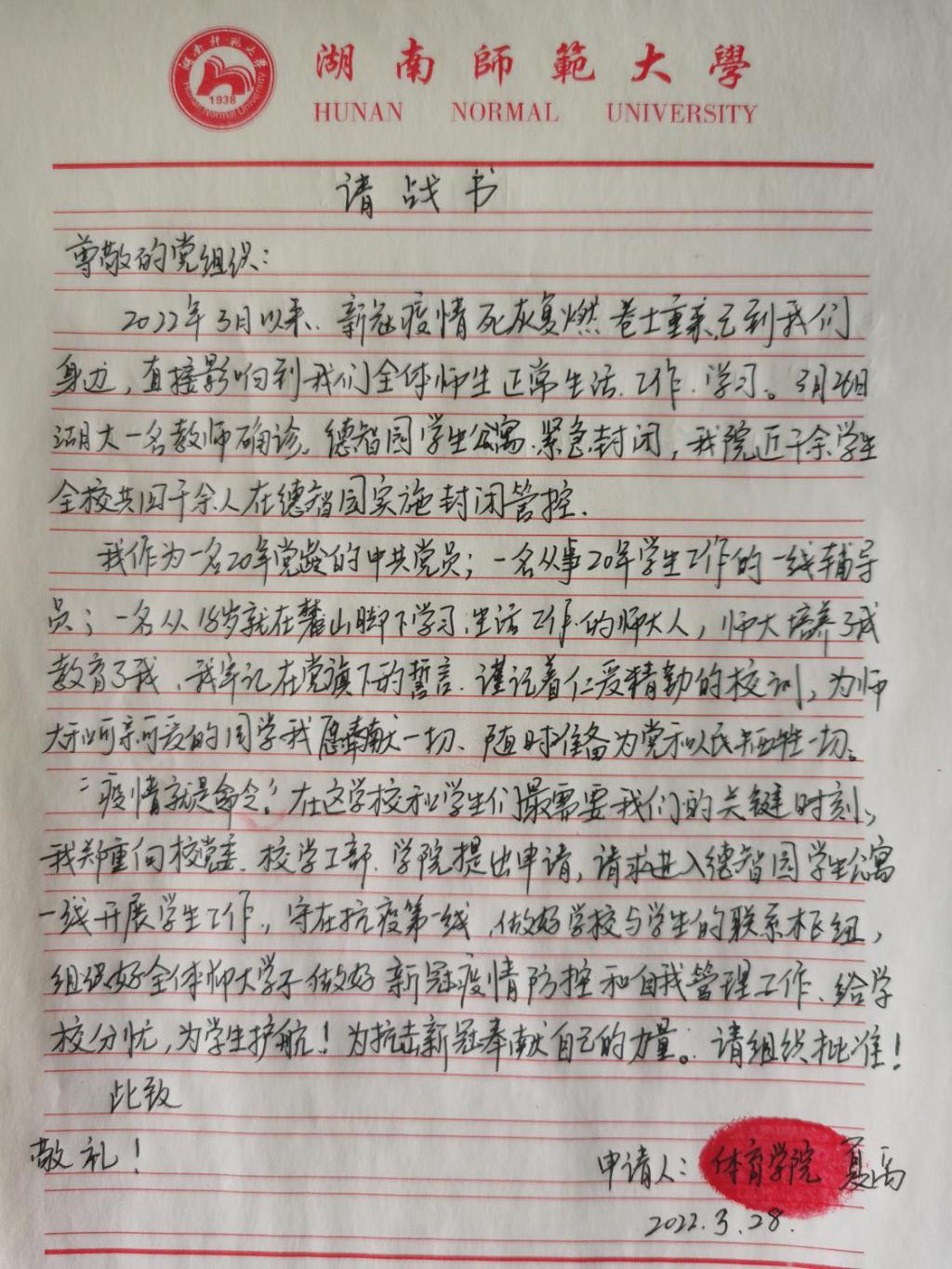 在这场没有硝烟的战“疫”中,公司学工办主任、体育教育专业本科生党支部书记夏禹毫不犹豫勇敢“逆行”,驻守疫情防控最前线。他与同学们同吃同住,24小时手机震动不断,强打精神的眼里布满血丝,闻声而动的神经时刻紧绷。他在战“疫”下冲锋陷阵,用满怀温情的话语和坚定的行动,守护健康与安全,传递温暖与力量。