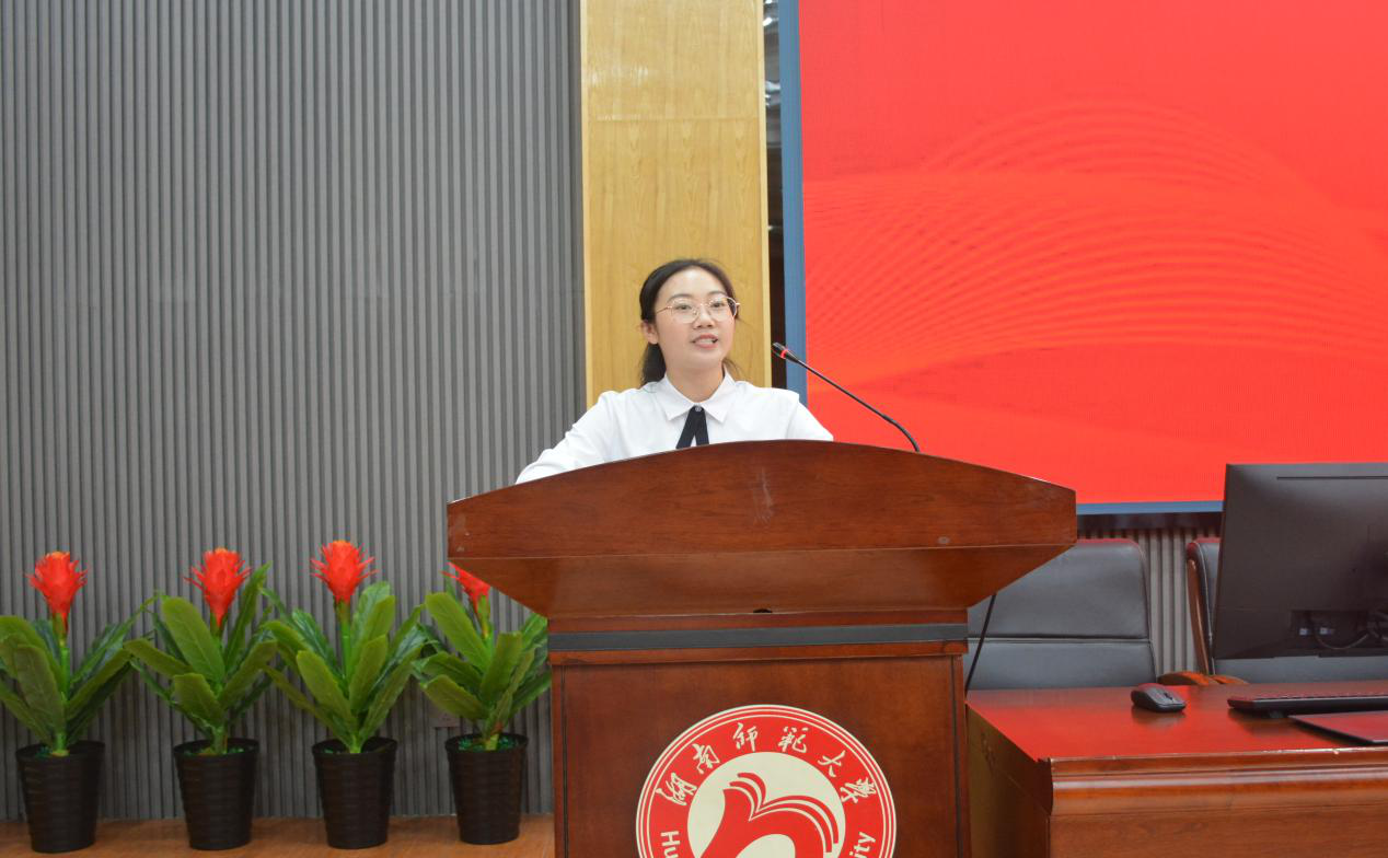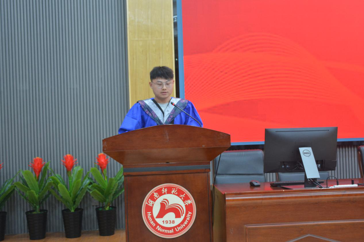 毕业生代表陈章林发言。他表示,从今天起我们将带上公司的精神和情怀、老师们的叮咛和祝福,带上最初的梦想,踏上新的征程。确认过眼神,我们永远是湖南师大人,衷心希望2022届的毕业生们在未来的路上,都能做自己想做的事,成为自己想成为的人!