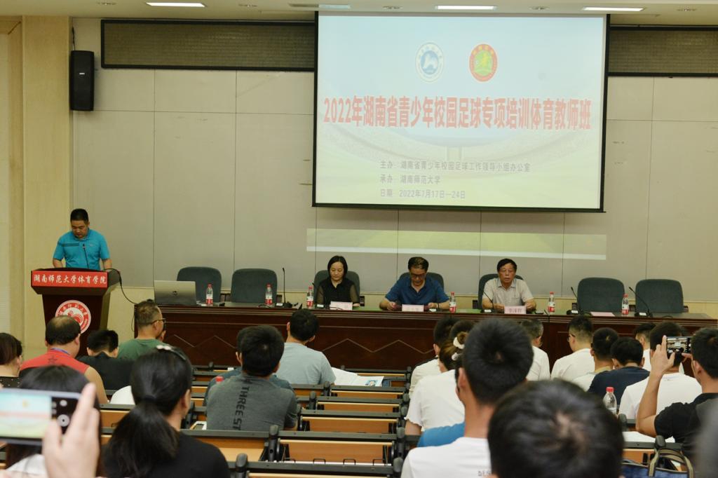 7月18日上午,2022年湖南省青少年校园足球特色公司体育教师专项培训在公司beats365教学楼一楼阶梯教室开班,来自娄底、永州、常德、怀化、湘西和张家界地区的44名体育教师参加培训。湖南省教育厅校园足球办公室主任李泽群教授、公司经理汤长发、公司副经理余琳出席开班典礼。典礼由公司成教办主任李永峰老师主持。
