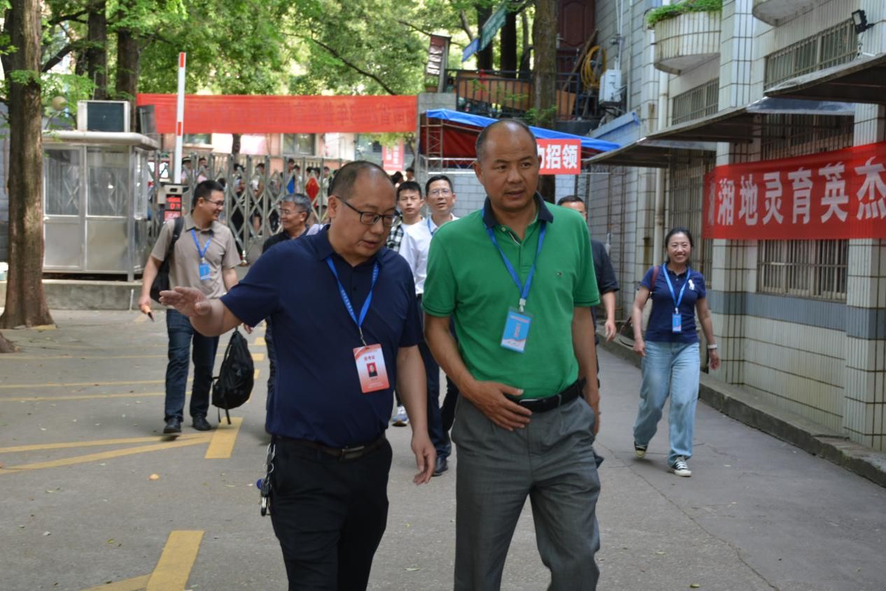 华致雄一行首先深入调研田径场考试现场,详细询问了湖南省体育高考项目设置、分数比值等基本情况,就百米考试和足球场地布置、仪器设置、防风雨棚、电子计时、工作人员分布等方面进行交流与讨论。随后来到监控室,询问了监控设施、各场地仪器研发供给、申诉流程等具体情况。华致雄表示:湖南省体育高考工作走在全国前列,组织管理、仪器设备、服务质量等工作均十分出色,并希望加强双方的合作交流。