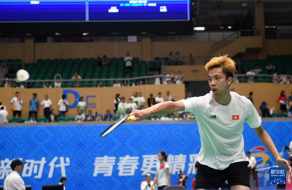香港队选手麦栢毅在单打比赛中回球。新华社记者陆波岸摄