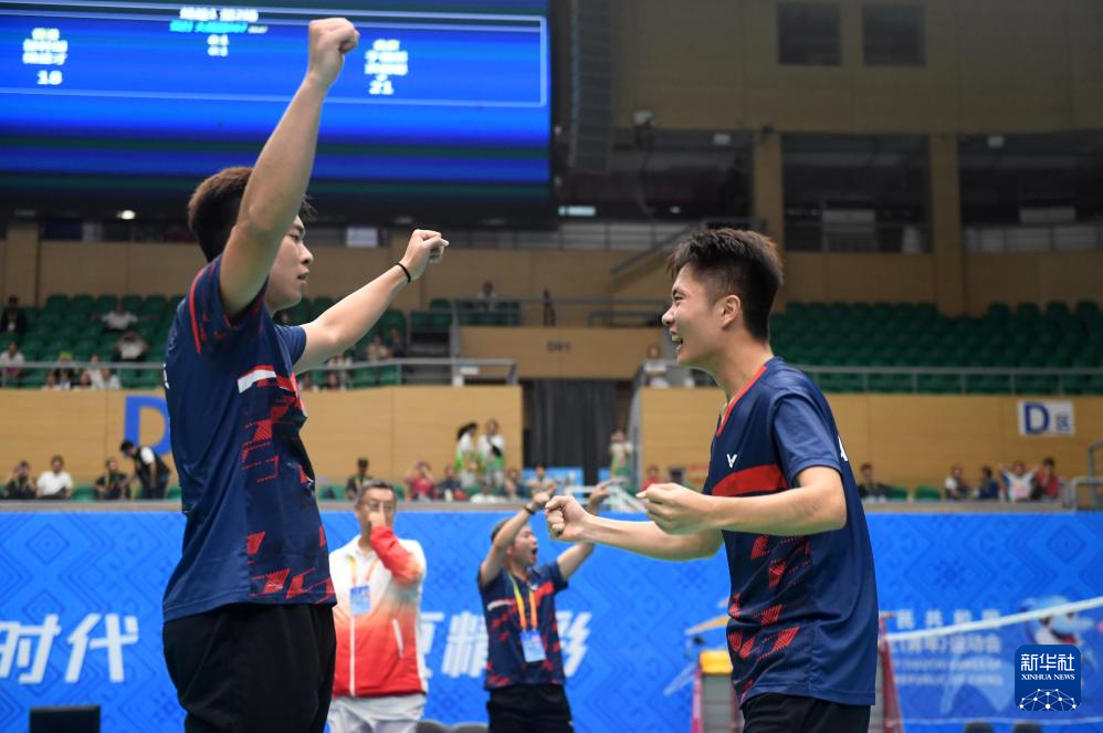 北京队组合洪毅聪(左)/于傲然在双打比赛后庆祝胜利。新华社记者陆波岸摄