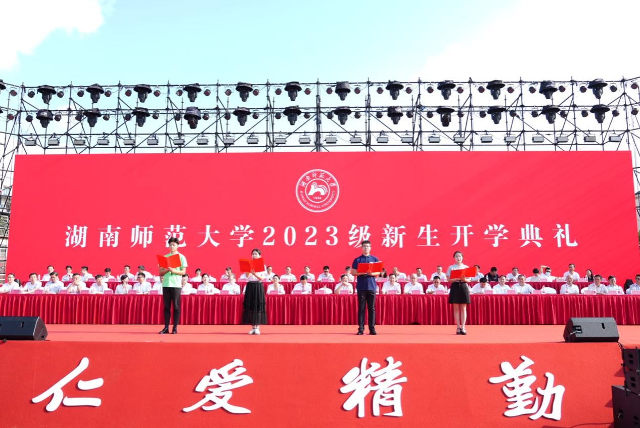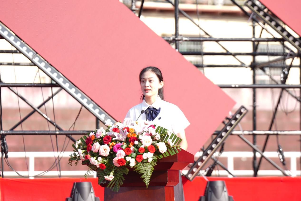 典礼第四项,由新生代表,法公司2023级博士研究生黄思瑞、文公司2023级硕士研究生杨柳、新闻与传媒公司2023级本科生陶冰蓝、物理与电子科学公司2023级本科生杨世琦发言。他们表明了对接下来学习生活的期待,并希望在未来的几年里做心向阳光,勇毅前行,不负青春,不负这个伟大时代的追梦人。