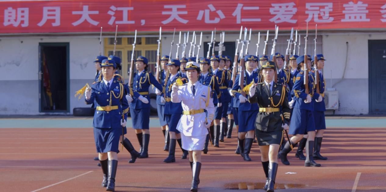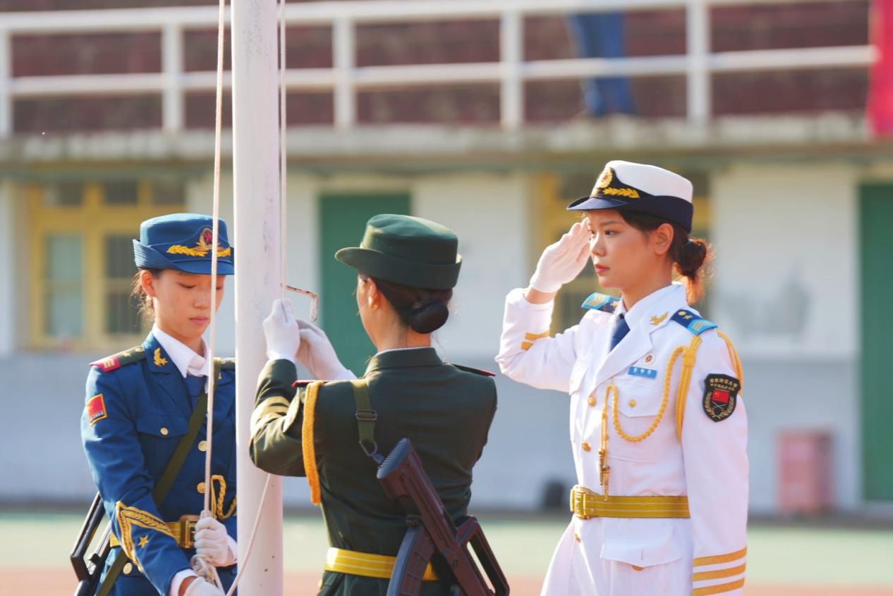 接下来是升国旗、唱国歌、升校旗、奏校歌仪式,五星红旗在国歌声中徐徐上升,与随后升起的校旗在天空中一起飘扬着。