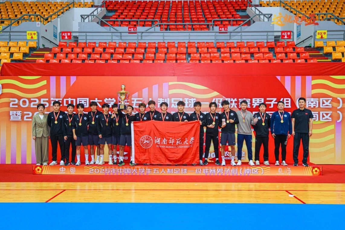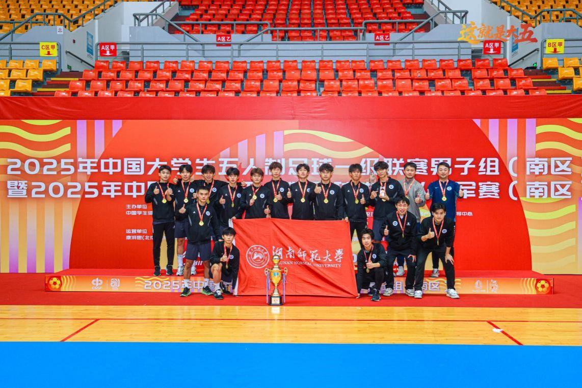 2025年11月4日,2025年中国老员工五人制足球一级联赛(南区)总决赛在浙江湖州体育馆落下帷幕,beats365官方网站男子足球队与北京理工大学、上海交通大学、南京大学、重庆大学、武汉大学、四川大学、东华大学、华中科技大学、湖北大学、三峡大学、华中师范大学、中南大学等全国各高校24支强队经过多轮角逐后,夺得了2025年中国老员工五人制足球一级联赛男子组(南区)“冠军”(如图一)。