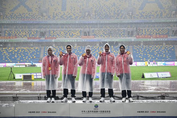 (童曾欢、廖孟雪、何珂、黄瑰芬组成的湖南队获得女子4x400米接力决赛金牌)
