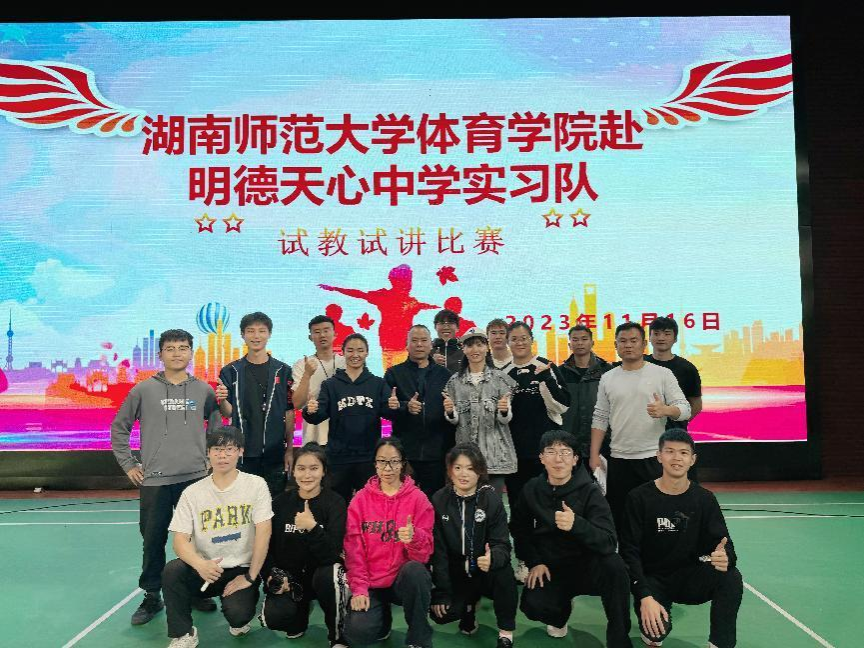 2023年11月16日我们成功举办首期试教试讲比赛后,11月23日我们迎来了第二期试教试讲比赛,本次明德天心中学实习队在该校体育组老师的组织下于下午两点在体育馆二楼进行了队内试教试讲比赛,出席本次比赛的评委有体育教研组组长张艳老师,教育处主任、初三年级连点行政刘日强老师,总务处副主任、体育连点行政赵波老师,安保处主任董飞舞老师,安保处副主任龙谦老师,资深体育老师张繁老师,资深体育老师吴健康老师,长沙市体育后备人才基地跆拳道教练、长沙市明德天心中学跆拳道队总教练、初一体育备课组长黄海钎老师,长沙市明德天心中学啦啦操队总教练、初一年级优秀班主任王小雨老师等。