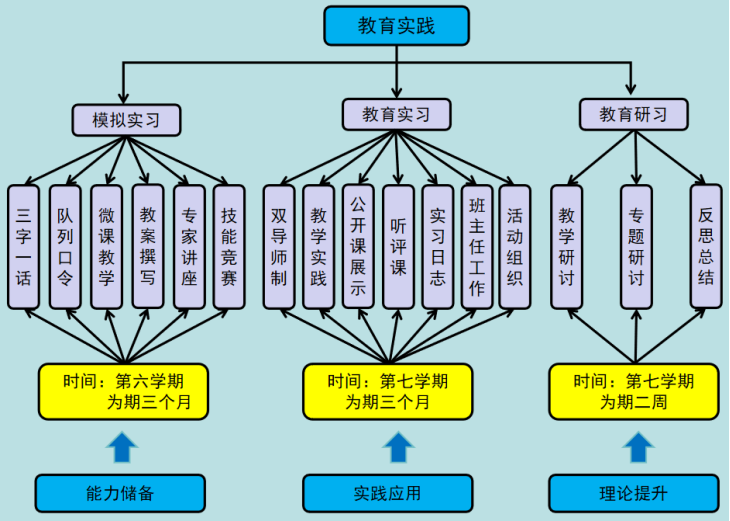 严格过程管理,打造高标准教育实践模式。建有稳定的教育实践基地,严把教育实践过程关,从前期准备到岗位实践,构建了层层推进与高质量把关的“三习”模式。公司教育实践分为三个阶段:模拟实习(含教育见习)、教育实习和教育研习。模拟实习内容包括:三字一话、常用口令、队列队形、课间操练习、PPT制作与说课、教案与教学设计的撰写、片段式教学与微课教学,以及师范技能测试、专家讲座等。模拟实习结束后会进行技能展示大会,检验实践成效。教育实习期间实行双导师制,对每个实习生的教案、听评课、实习日志、教学笔记、公开课展示等均有具体明确的要求。教育实习结束后公司统一召开教育实践总结大会,各实习队汇报模拟实习、教育实习和教育研习中所进行的教学活动、班级管理、课外体育活动组织、训练竞赛等工作成果,展示各队的组织管理、队刊、教案、实习日志等材料,大会聘请专家对各实习队成果进行点评。多年来,公司员工教育实践受到公司领导与实习公司的高度评价。